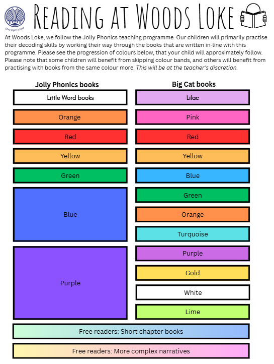 At Woods Loke, we use book bands to help ensure that our children are reading a variety of high quality texts at an appropriate level that is carefully aligned with Jolly Phonics. All pupils should read a book that is fully decodable to them. Our bands follow the progression of the teaching of sounds in Jolly Phonics.